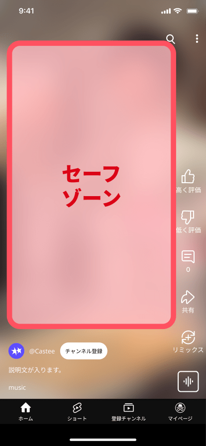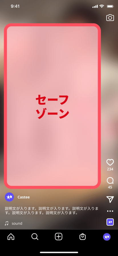 セーフゾーンとは、SNS上で動画の重要な情報(テキスト、ロゴなど)が隠れないように配置するためのエリアを指します。特に縦型動画では、UI(ユーザーインターフェース、たとえば「いいね」のボタンや投稿文のテキストなど)要素が動画の一部を覆うため、セーフゾーンを意識したデザインが必要です。