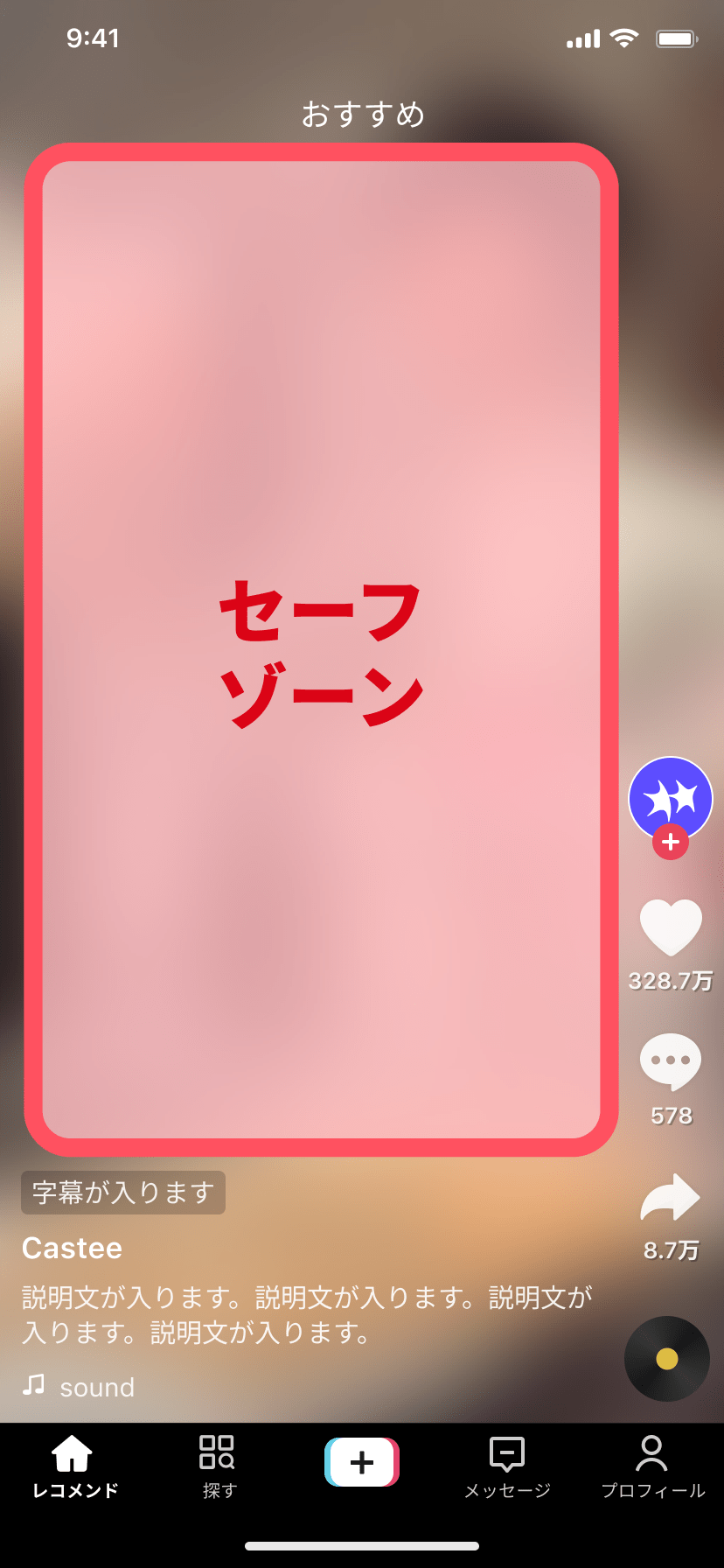 これらを避けるため、TikTokでは動画全体の中央約70%に重要な要素を配置するのが推奨されるセーフゾーンです。